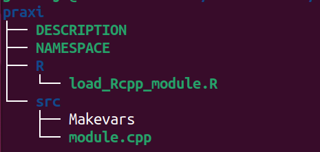 Ultimately, an R package is just a collection of appropriately named files in a prescribed directory structure. There are many tools to help you construct an R package, but the minimal Rcpp enabled package is quite simple to create. The figure below shows the basic directory structure and files needed to create a minimal Rcpp package.