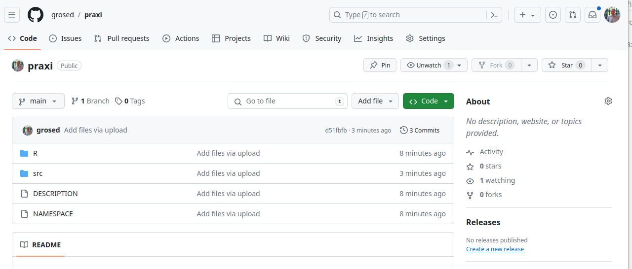 The easiest way to organise an R package on github is to create a new repository with same name as the package. The files and directories within the R package are then added to the repository (i.e. the top level package directory is not included. For example, in the case of the praxi package the repository should look like.