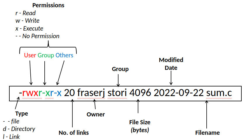 Using -l with ls shows the properties of the files listed. Here is an annotated view of this information (from someone else’s account).