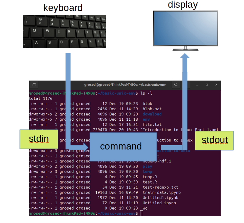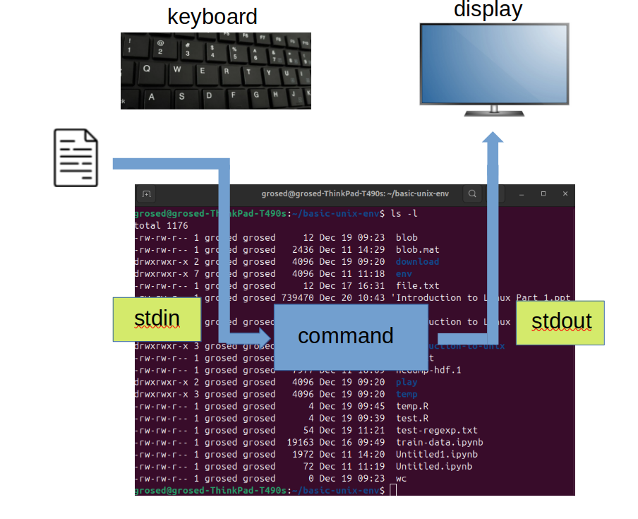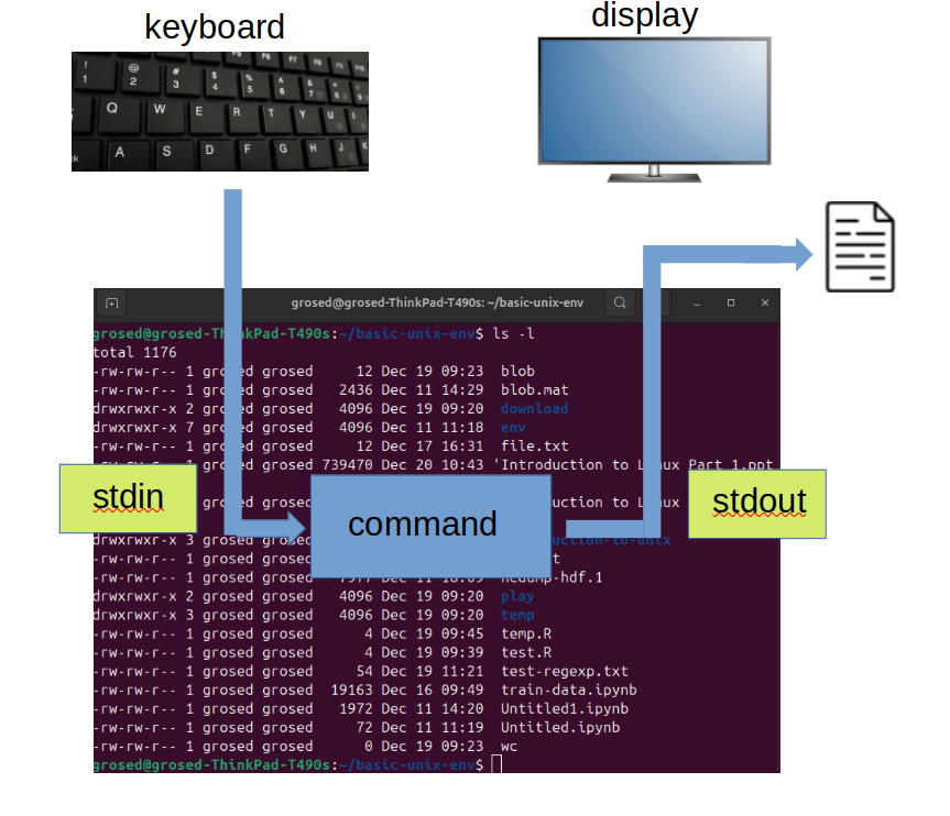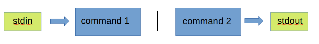 Unless specified by a user, the files which are used for communication between tools are managed by the shell. The default used for input is called stdin and for output stdout (short for standard input and standard output). Here is what things look like when you use a unix command.