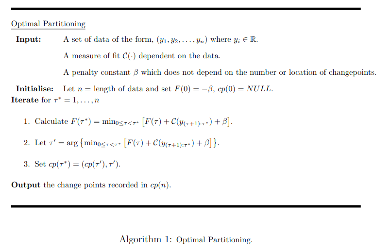 The following is pseudo code for the optimal partitioning algorithm as described in “Optimal detection of changepoints with a linear computational cost” by Killick, Fearnhead, and Eckley