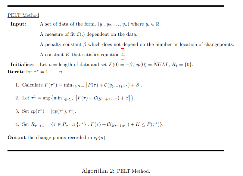 The following pseudo code is for the PELT methos which is an extension to the Optimal Partitioning Method described previously.